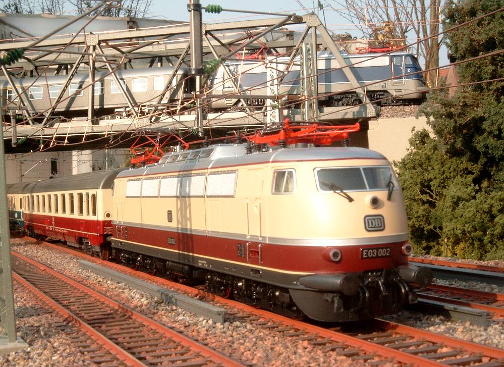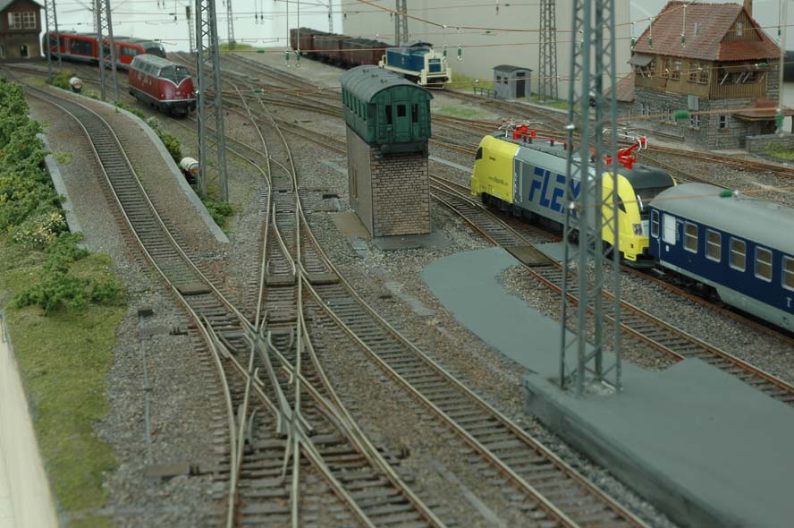 von nur 1,2 Metern ein vorbildgerechtes Gleisvorfeld aufgebaut werden kann. Die vielfältigen Fahrmöglichkeiten garantieren einen abwechslungsreichen Fahrbetrieb. Die Kombination unterschiedlicher Weichenwinkel von 9° und 12 ° fügen sich harmonisch zu einem Gesamtbild zusammen. Selbstverständlich sind alle Herzstücke polariesiet, um auch Loks, die eine schlechte Stromabnahme haben, eine gleichmäßige Fahrt zu ermöglichen. Eine leistungsfähige Software lassen bis zu vier gleichzeitig ein und ausfahrende Züge zu. Eine Oberleitung von Sommerfeldt und ein seitlich angelegter Ablaufberg runden das Gesamtbild ab. ![]()